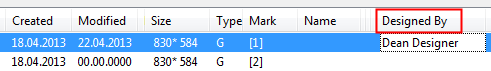 Document manager contains a column for the new user-defined attribute, and the name of the designer is displayed: