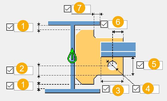 Joist to beam, type 1 (160) creates a bolted connection between a beam and a joist. You can define the seat angle size and bolt locations.