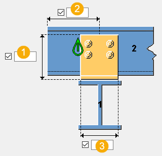 Cold rolled overlap (1) connects one or two purlins or rails to a rafter or a stanchion. Some properties of this component are loaded directly from the overlap.dat file. Contact your local Tekla Structures support if you need to customize the component more than the dialog box allows.