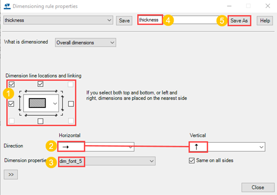 In the Dimensioning panel, select thickness in the Properties column as the property file for the overall dimensioning rule.