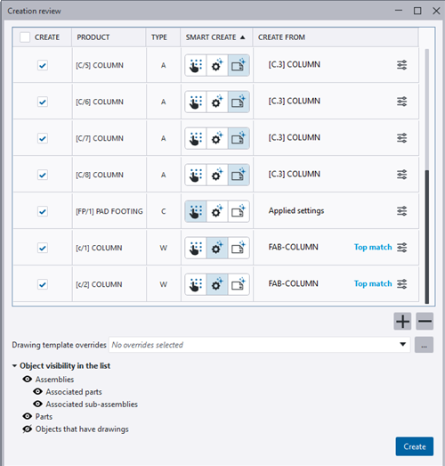 You can efficiently manage the creation process, and select the best matching drawing template or saved settings automatically detected in the current model, or alternatively, select settings for every individual model object.