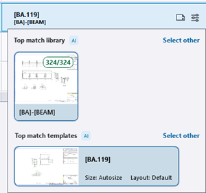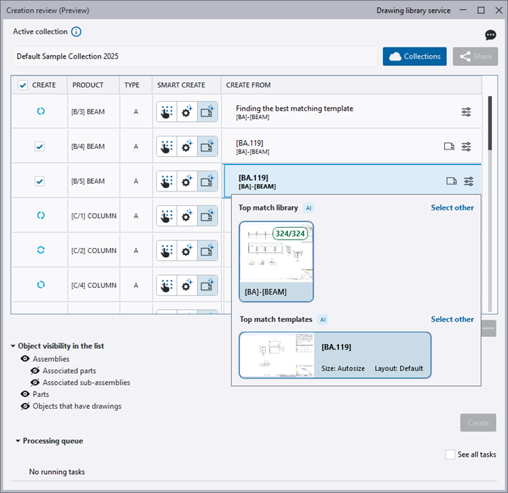 You can create assembly or cast unit drawings either from the best matching drawing templates using cloning or from the settings used by the best matching drawings. Single-part drawings cannot be created using the AI and fabrication drawing cloud collections but they can be created using the applied settings or other saved settings.
