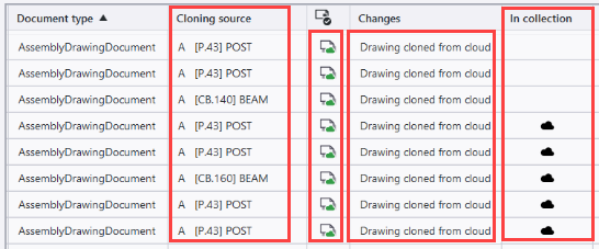 AI Cloud Fabrication drawings command. Additionally, the Cloning source column shows the drawing templates that were used.