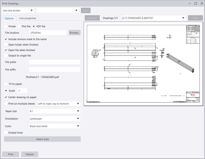 You can print drawings as PDF files, save them as plot files (.plt) for printing with printer/plotter, or print them on a selected printer. Tekla Structures provides a real-time preview of drawings in the Print Drawings dialog. You can also change the output colors and line widths.