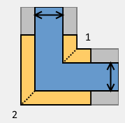Each condition consists of two or more sub-assemblies of the formwork components, depending on the condition type. For example, the L corner contains the inner corner assembly (1) and the external corner assembly (2). When inserted in the model, the location of these assemblies is controlled with the main insertion points and the two wall thickness parameters.