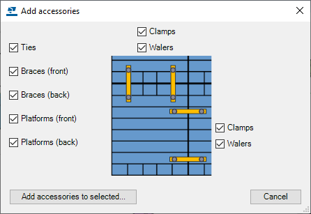 Alternatively, to add walers automatically, click Apply and Add to selected. The Add accessories dialog opens where you can select which accessories are added with the walers. Click Add accessories to selected. The walers and other accessories are placed automatically to the selected panels.