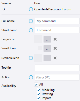 The user-defined commands are saved to ..\Users\<user>\AppData\Local\Trimble\Tekla Structures\<version>\UI\Commands folder.