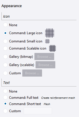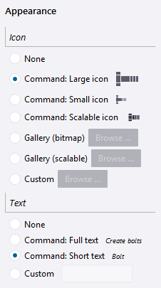 You can add buttons simply by selecting a button type and its appearance and then dragging the command to the ribbon or to the Quick Access Toolbar.
