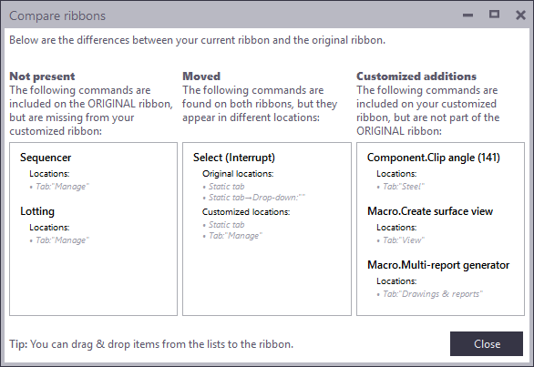 You can compare the original ribbon with the changes you have made. You can check what has been added and removed, and what has been moved to different tabs.