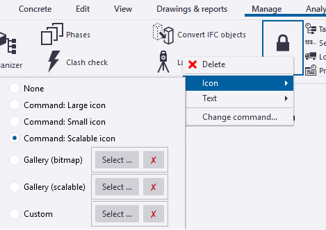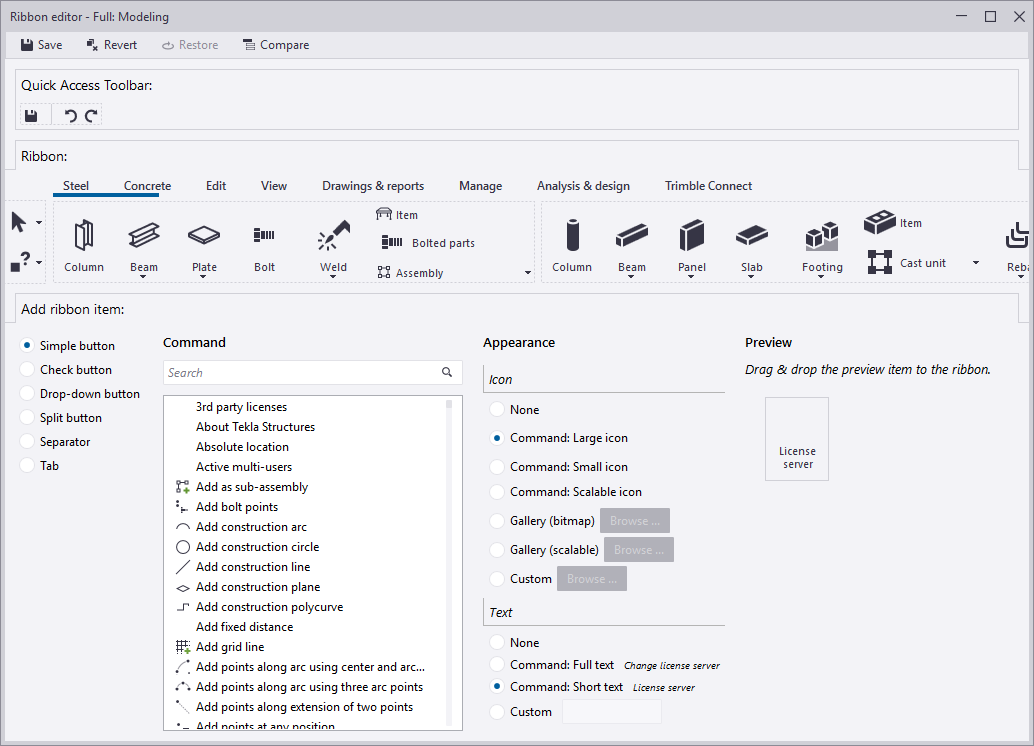 You can add, move and rename ribbon tabs, choose how they are aligned, and hide some tabs if you do not need them in your current project. For example, if you are only modeling steel parts, you can temporarily hide the Concrete tab.
