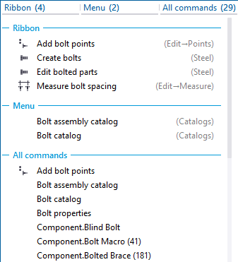 command. You can navigate in the list by clicking the Recent, Ribbon, Menu, and All commands tabs. The Recent tab lists 10 most recently started commands from the search results.