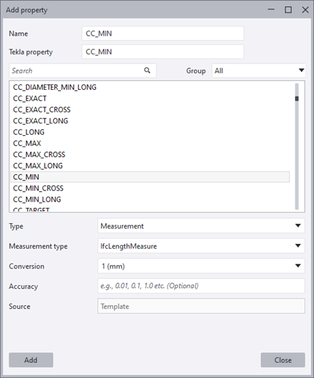 You can create property sets from template attributes and user-defined attributes, define properties for the attributes, and bind the Tekla Structures property sets to IFC entities for IFC export. You can save the property sets in property set configuration files.
