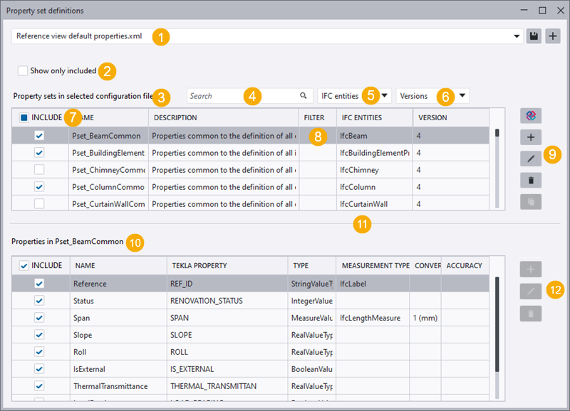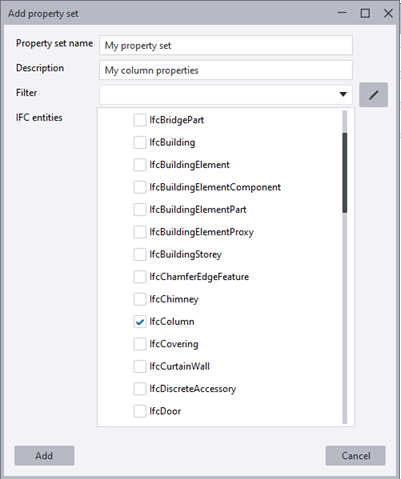 The Property set definitions dialog allows you to add and modify the property sets needed in the IFC export. The property set configuration files that you create, will be visible in both IFC2x3 export and IFC4 export.