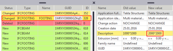 The changes list and the property details list are displayed. The changes list content is based on the IFC content and has all physical object types. The colors are the same as the ones in Change detection.