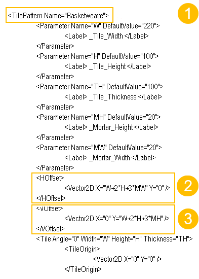 This example explains how the Basketweave tile pattern is defined in the TilePatternCatalog.xml file.