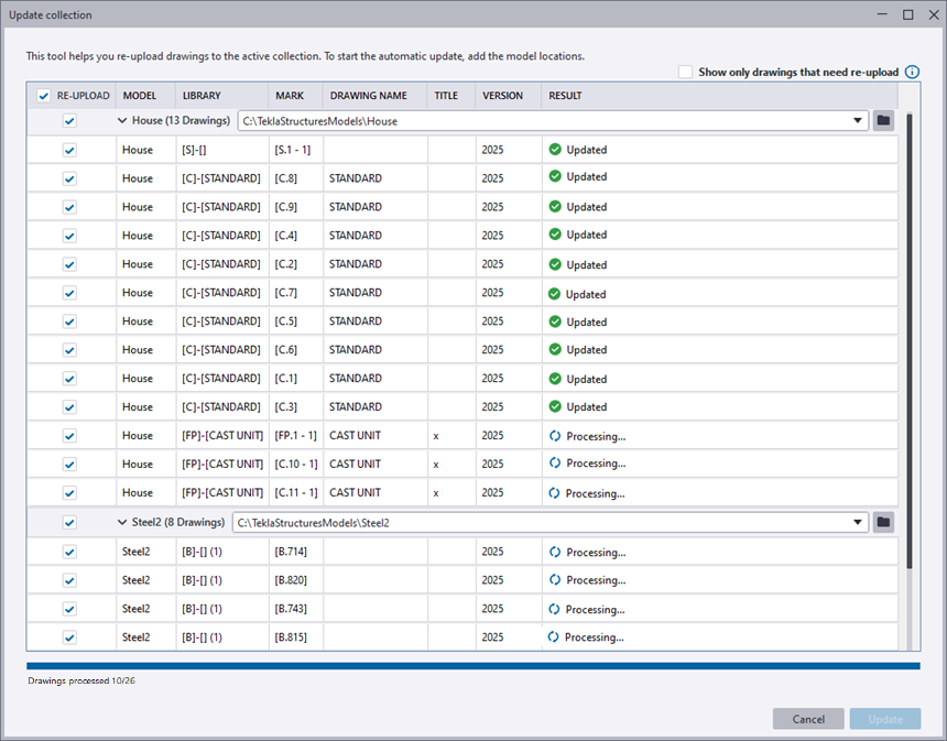 Note: If you are using the Update collection dialog to re-upload drawings in the currently open model, we recommend that you save the model beforehand, so that the latest drawing status can be retrieved.
