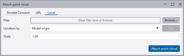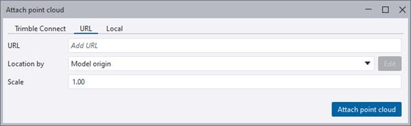 The Attach point cloud dialog has been changed so that attaching point clouds hosted in a Trimble Connect project, attaching point clouds from web, and attaching point clouds locally now have tabs of their own: Trimble Connect, URL, and Local.