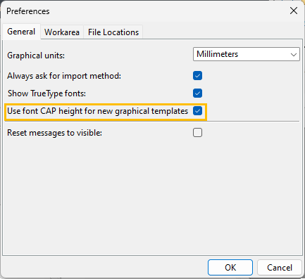 If you have started Template Editor from outside Tekla Structures from the Microsoft Windows Start menu, the option is controlled by the Template Editor preferences, and whether you have selected the User font CAP height for new graphical templates checkbox: