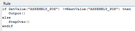 != | Sides are not equal | This rule checks if the assembly position is not equal to the next value of assembly position. If this is true, the row is output. If they are equal, the condition is false, and printing the row is skipped.