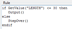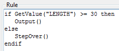 >= | Right side is smaller or equal | This rule outputs values with a LENGTH equal to and greater than 30, anything less than 30 is skipped.