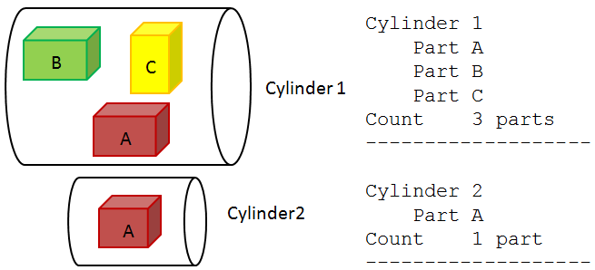 Cylinder_1 and Cylinder_2 | Describes an object in the database, like an assembly. After this row is output, processing continues to the next parts in the hierarchy. |