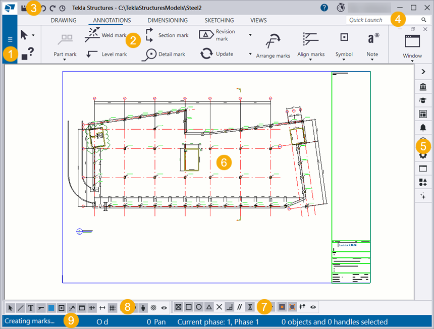(5) Use the side pane to open 2D Library, Instructor side pane, or Drawing content manager, view notifications and adjust notification settings, access Online Services, view and modify object properties, manage model views, open the Applications & components catalog, and access Trimble Assistant for Tekla.