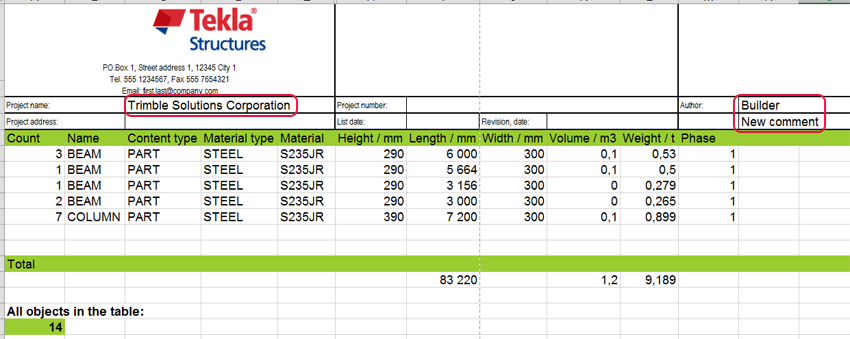 The values of the project properties that you added to the Excel template are shown in the exported Excel.