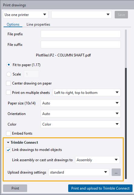 Click Print and upload to Trimble Connect to upload the PDF drawing to the set folder in Trimble Connect.