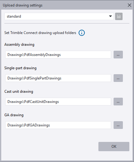 If you have not yet selected the PDF drawing upload folder for each drawing type in Trimble Connect, you can do it by clicking … next to Upload drawing settings. By default, the current settings are used.