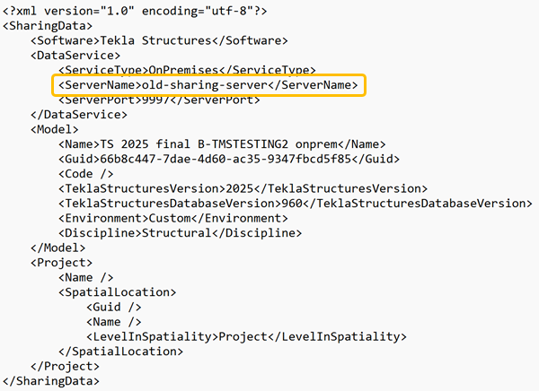 5. If the new server name is different from the old server name, users must follow these steps to connect to the on-premises sharing service for Tekla Model Sharing on the new server: