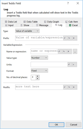 - To add the variable details into the Log field, click the Insert button next to the No. of decimal places box.