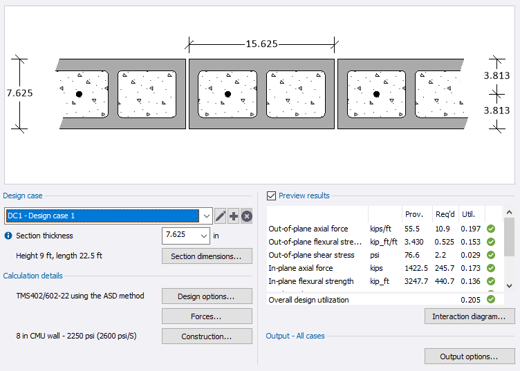 New calculation in Tedds 2024 which checks the capacity of one or more cross-sections of a concrete or clay masonry wall panel comprising of single-wythe construction featuring solid or hollow masonry. Hollow units may be grouted and include vertical and horizontal reinforcement. The cross-section designs for the wall panel may be subject to axial forces and in-plane and out-of-plane moments and shears. The calculation includes designs in accordance with both the allowable stress design (ASD) and strength design (STR) methods for TMS 402/602-22, TMS 402/602-16 and TMS MSJC-13.