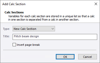 - Click OK and this will enter a Calculation Section Title in the document. We place a calculation below this title and thus within the section. You should note that your cursor is now on the line below the section title.