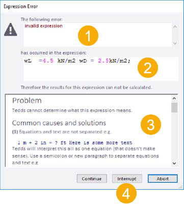 - If you have an error in your calculations, Tedds will inform you when you calculate your document and the error is encountered. The first thing you should do is Interrupt the calculation process.