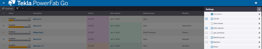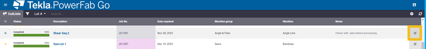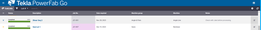 En Tekla PowerFab Go, ambos pueden ver las listas de corte guardadas para un trabajo en Tekla PowerFab , cambiar ítems en listas de corte y cortar los ítems que aún no hayan sido procesados.
