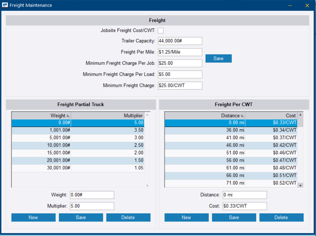 - Para cambiar los costos del flete entrante y los ítems comprados, en la sección Flete del cuadro de diálogo Mantenimiento del flete, modificar la capacidad del remolque, los costos de flete en la obra y los costos de flete mínimos.