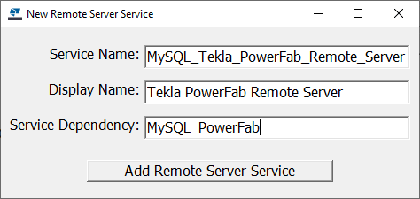 Dependencia del servicio: Debe coincidir exactamente con el nombre del servicio de MySQL de la base de datos de Tekla PowerFab. MySQL Service Manager muestra los nombres de los servicios MySQL para todas las instancias de base de datos que se ejecutan en la máquina.