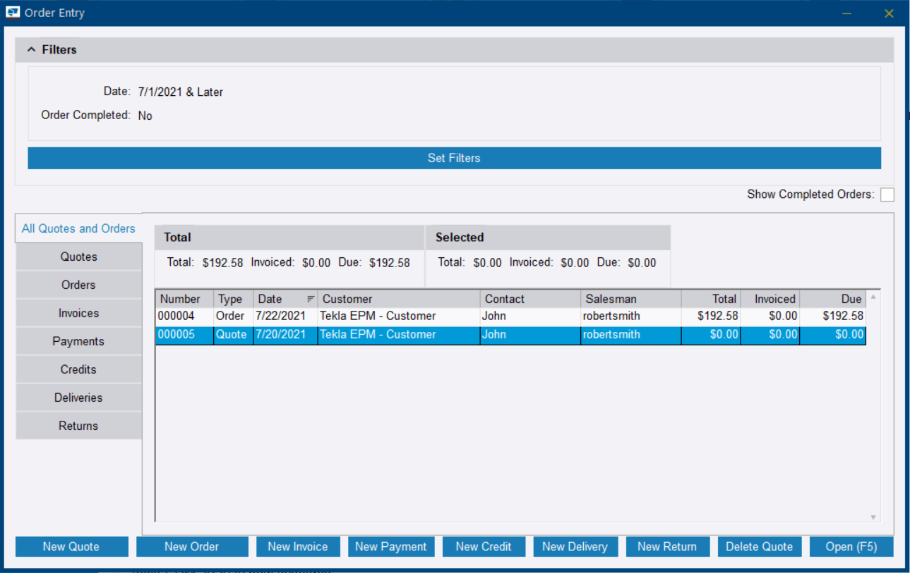 Los pedidos y cotizaciones mostrados en el cuadro de diálogo Registro de pedido se actualizan para coincidir con los filtros configurados.