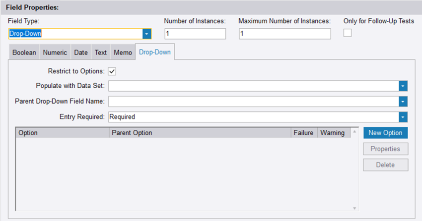 Puede agregar, actualizar y eliminar una opción de campo desplegable cuando crea un nuevo campo de ensayo de inspección o modifica las propiedades de uno existente en Mantenimiento.