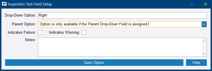 Puede administrar las opciones del campo desplegable en el cuadro de diálogo Configuración campo ensayo de inspección.
