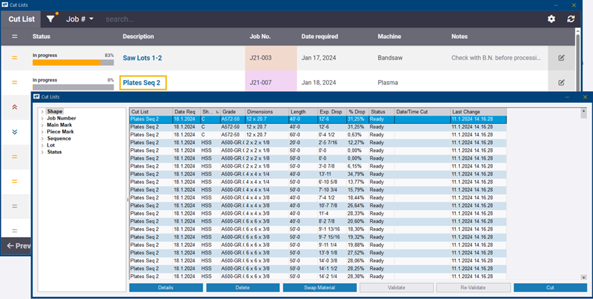 Se puede acceder rápidamente a las propiedades de la lista de corte mediante los tableros. Se pueden ver y modificar las propiedades y las listas de corte de proceso.
