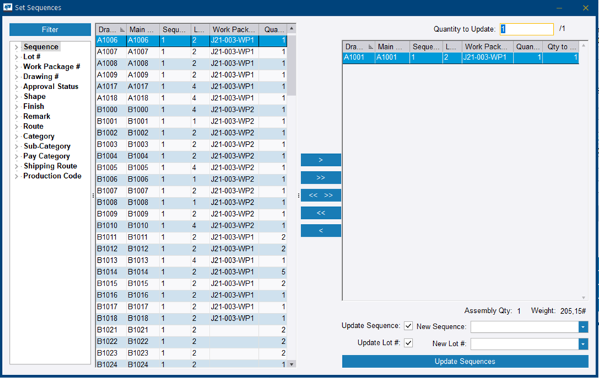 Cantidad a actualizar: Si solo desea agregar una cantidad específica de piezas a la secuencia, seleccione el elemento en el lado derecho del cuadro de diálogo y escriba un nuevo valor en el campo.