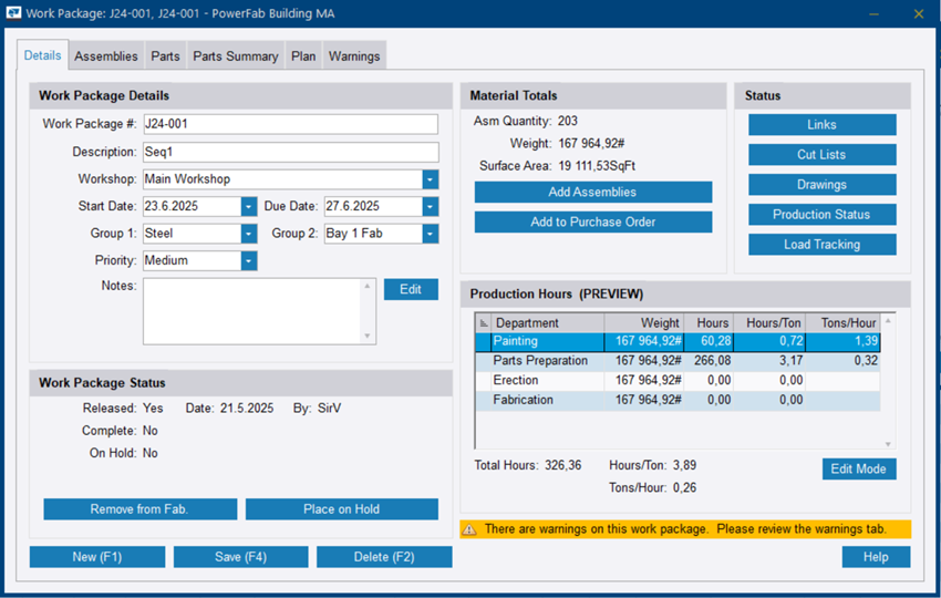 El campo Detalles muestra un mensaje que indica que hay advertencias sobre el paquete de trabajo.
