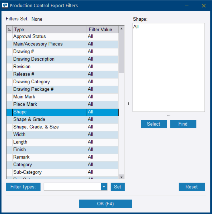 Se abre el cuadro de diálogo Filtros para Exportar Control de Producción.