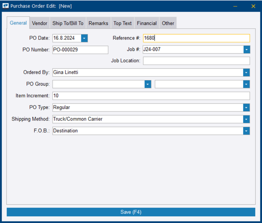 La pestaña Otro le permite ingresar detalles extra en la orden de compra. Los campos rellenados aparecen en el documento de la orden de compra.