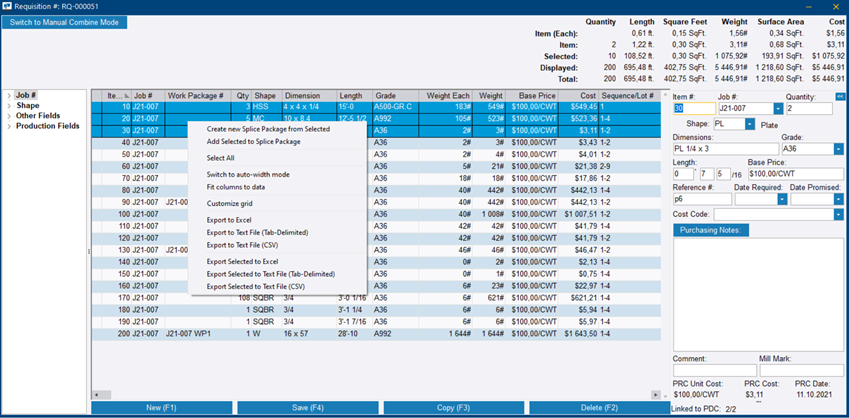 Alternativamente, puede hacer clic en Agregar para crear una nueva orden de compra. Después de abrir el pedido de compra, se abre el cuadro de diálogo Paquete de empalme. En la parte superior del cuadro de diálogo, puede comprobar los detalles del paquete de empalme finalizado, incluida la forma, el grado, la dimensión y la longitud total. También puede verse qué porcentaje del paquete de empates se está utilizando actualmente.