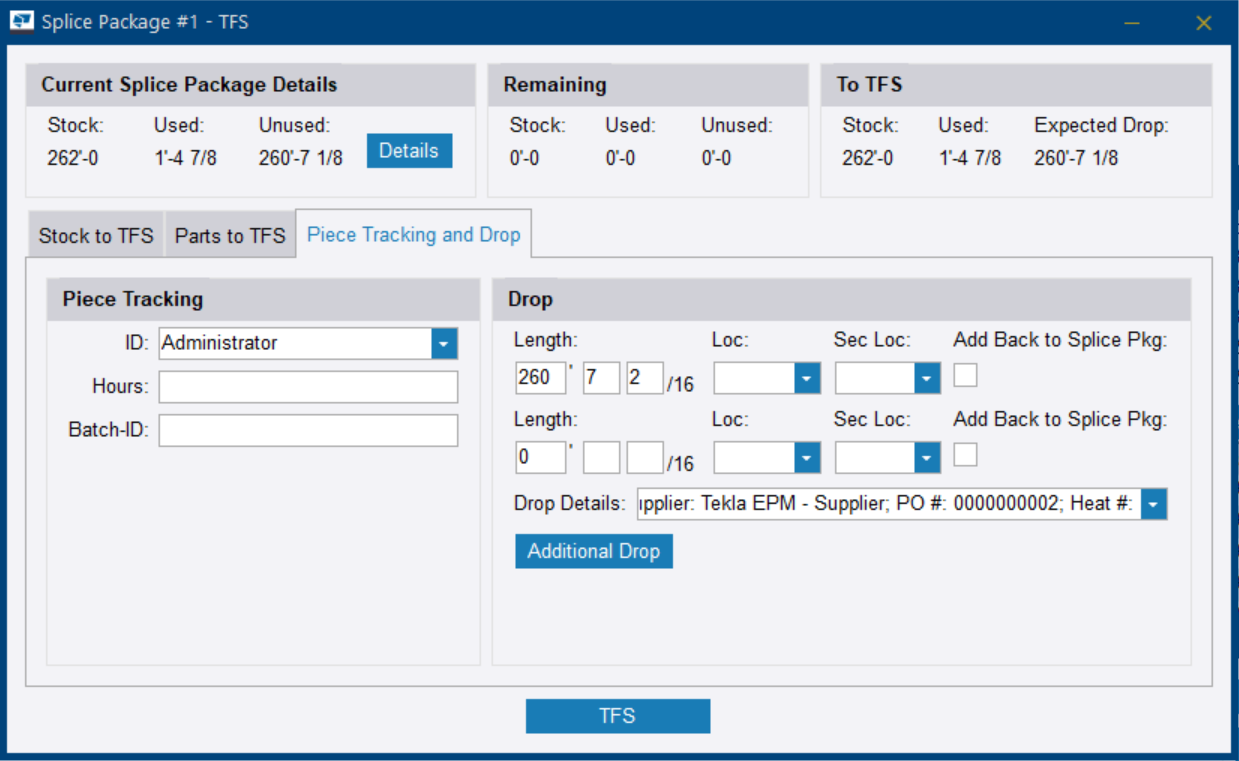 La longitud sobrante se completará con la cantidad calculada a partir de la existencia total incluida y la longitud de la pieza. Si no se incluyen algunas existencias o piezas, permanecerán en este paquete de empates para ser procesadas en otro momento.