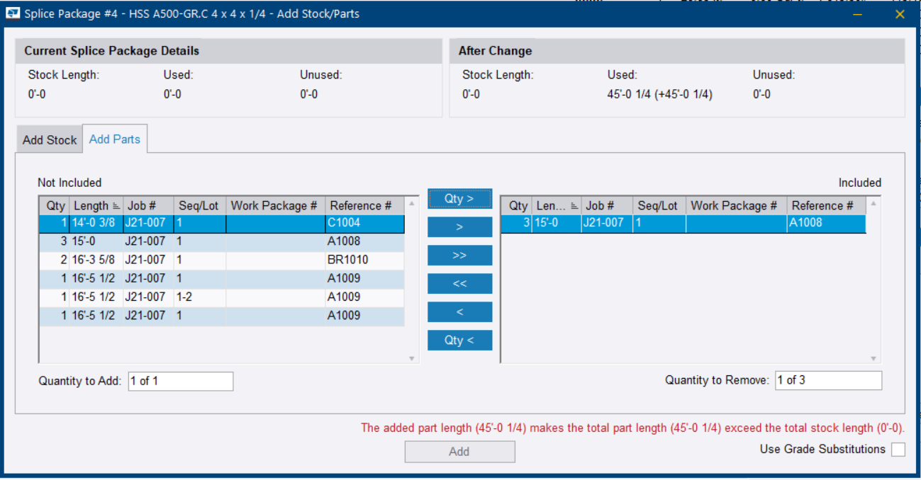 - En la pestaña Partes a SDE, mover las piezas que se van a cortar de esa existencia a la lista Incluido.