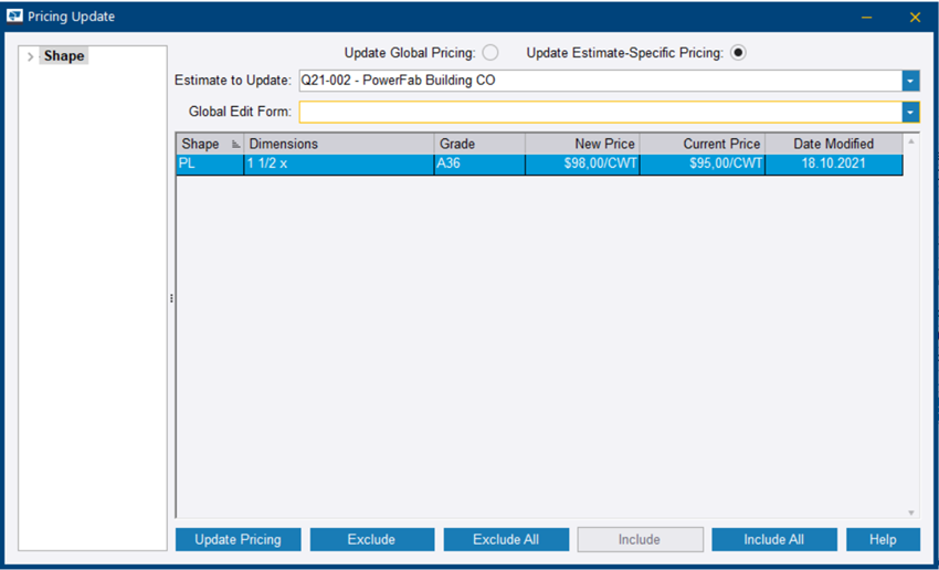 Si el perfil, el grado o la dimensión del material no existen en la base de datos de mantenimiento de precios, se agrega a la base de datos cuando actualiza el precio.