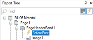 De forma predeterminada, el Árbol de reporte muestra componentes y eventos. Los componentes son Ítems del reporte como encabezados de página, campos de texto y etiquetas. Los eventos que se muestran aquí se gestionan en la pestaña Eventos del panel Árbol de reporte.
